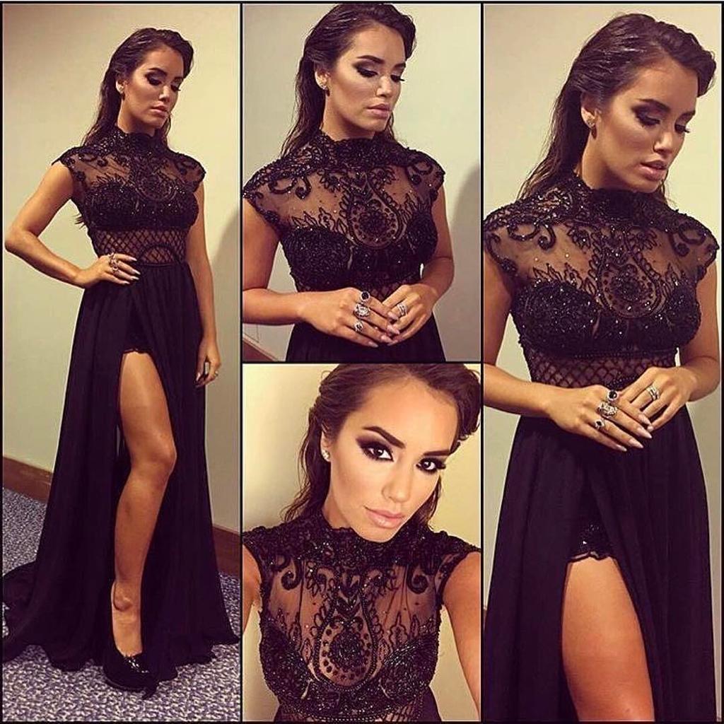 A rich beaded lace top with chiffon skirt and hi slit in black.
