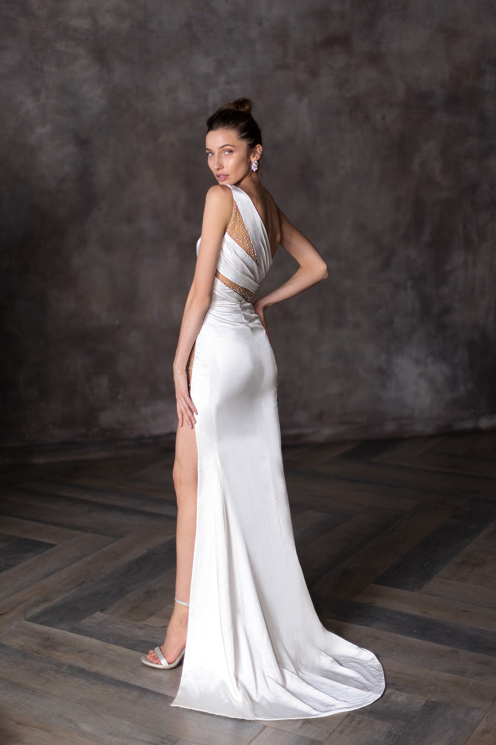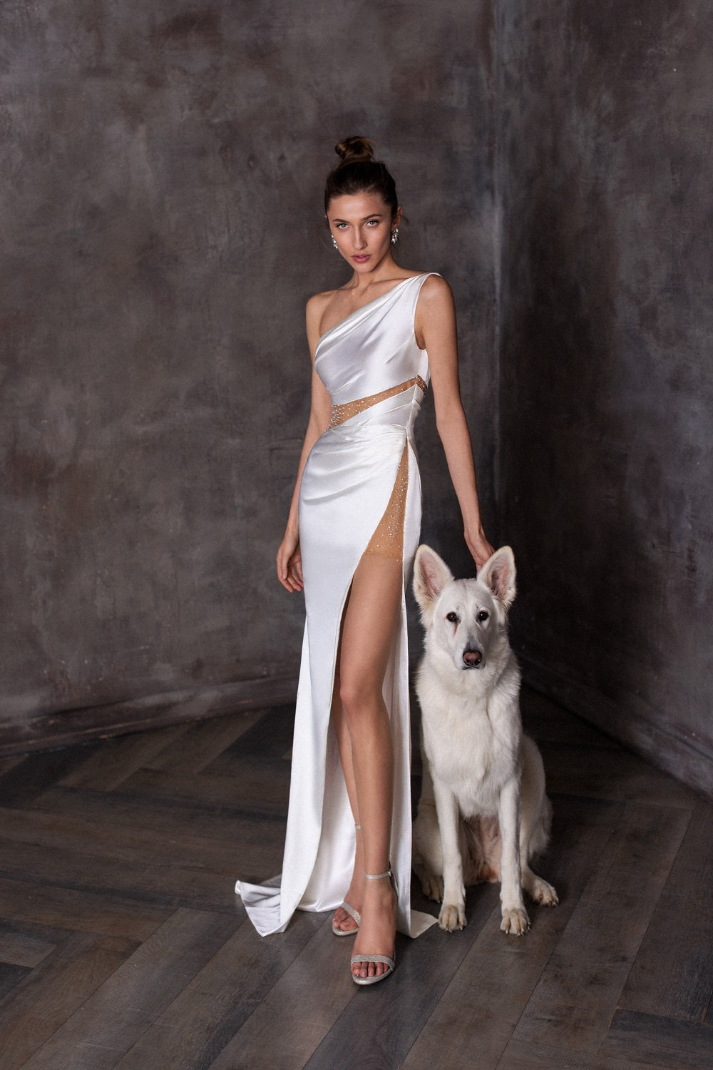 Bright and light white dress, one shoulder, wraps around the body, has a decorative rhyme at the base of the dress that gives beauty in the small details, a leg split ... Perfect for your energetic evening