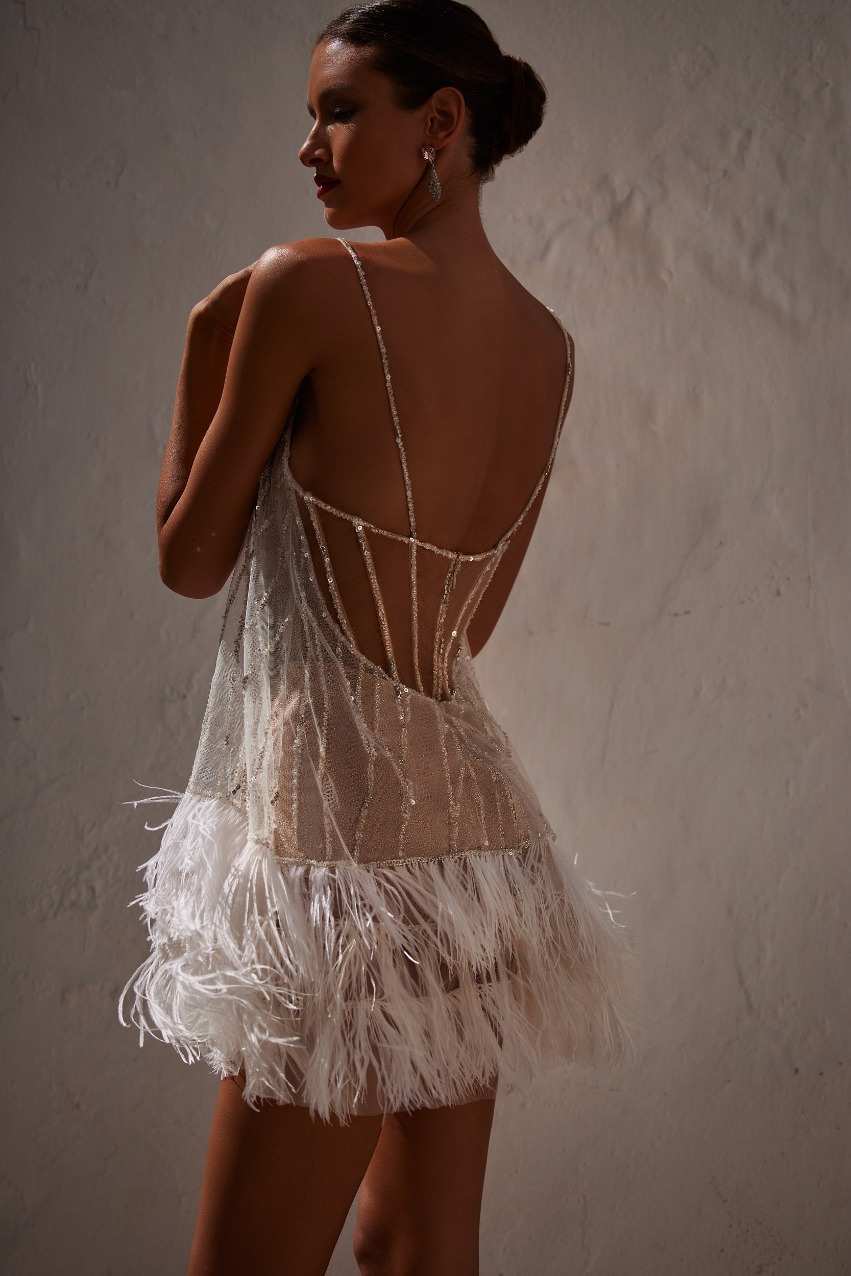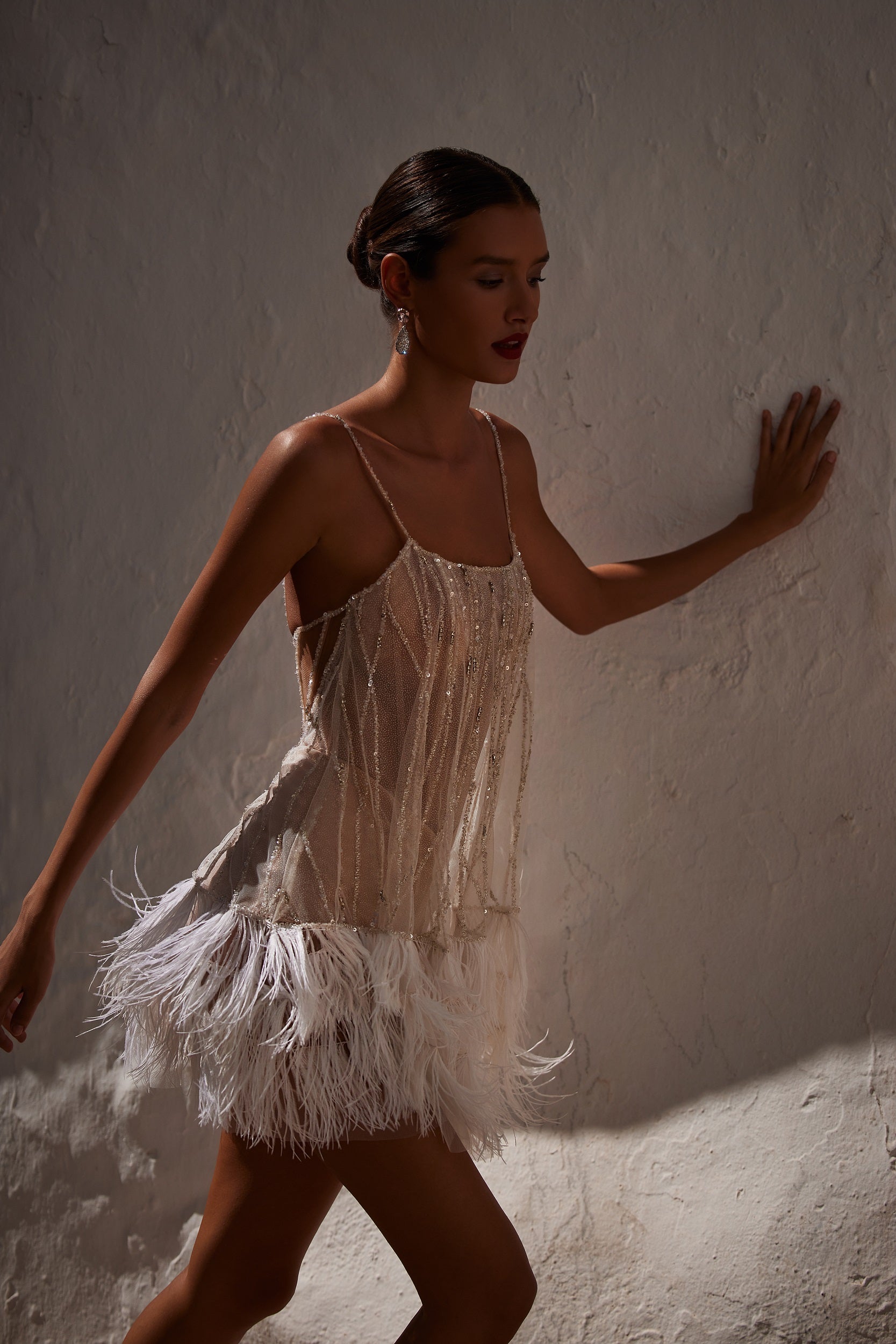 Mini dress with delicate lined fabric and feathers on the bottom, from the Second Skin collection.