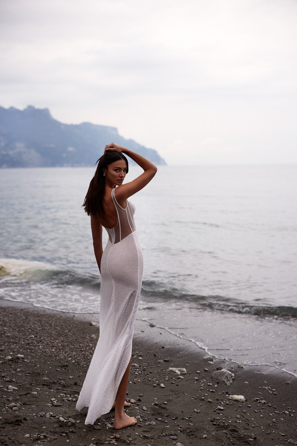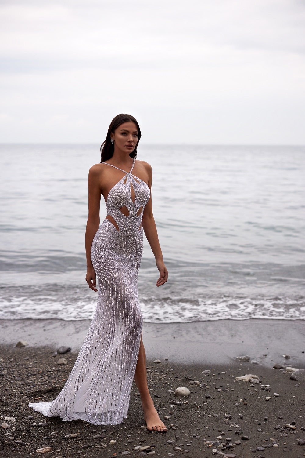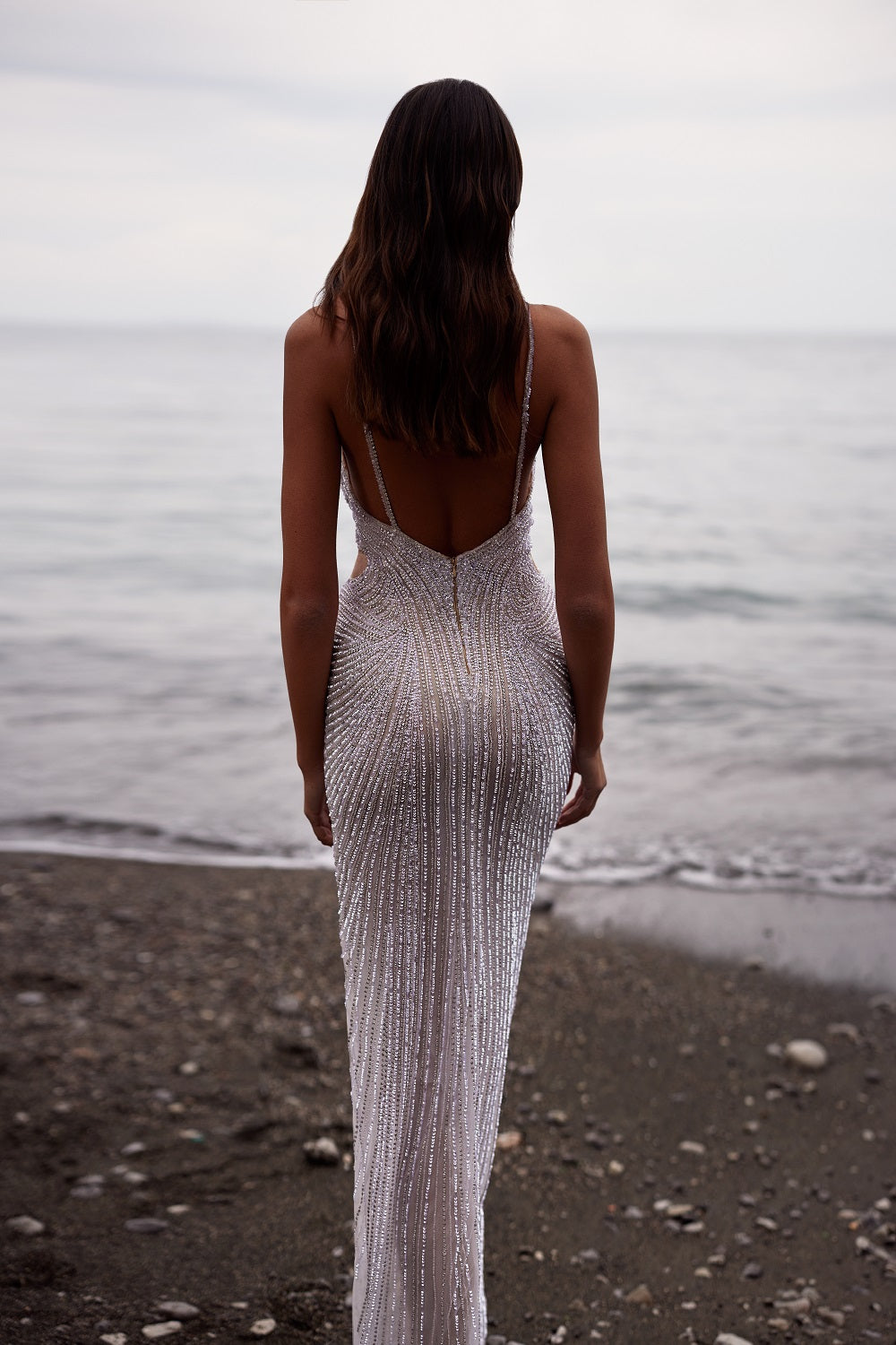Tight dress , there are openings along the dress, deep sexy slit in the leg area, delicate handmade beads , And a special cleavage closure that continues to the back