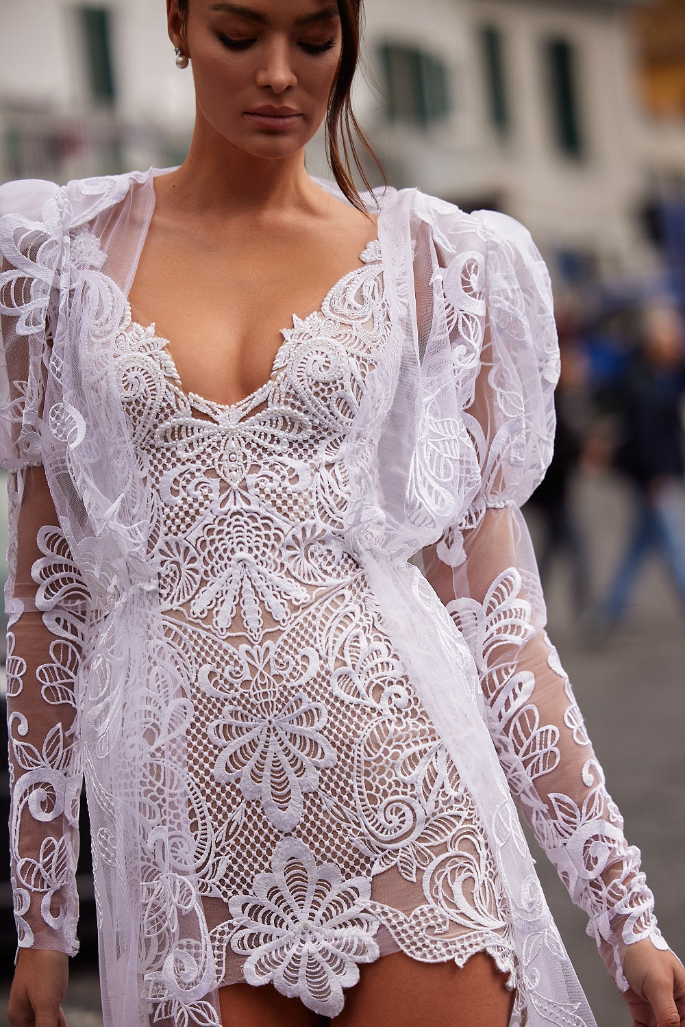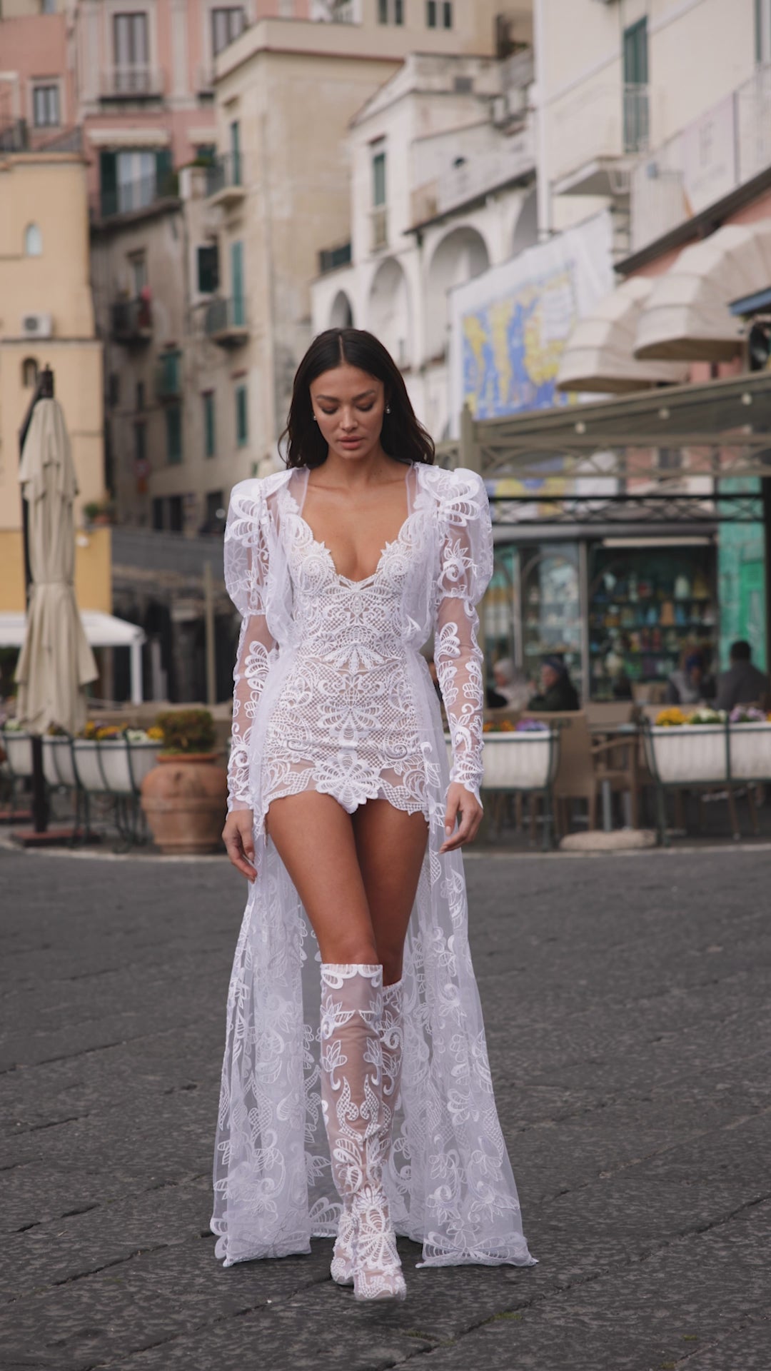 A mini dress decorated with lace flowers, straps, comes with an impressive long bolero decorated with the same floral lace fabric, and matching high boots from the same decoration