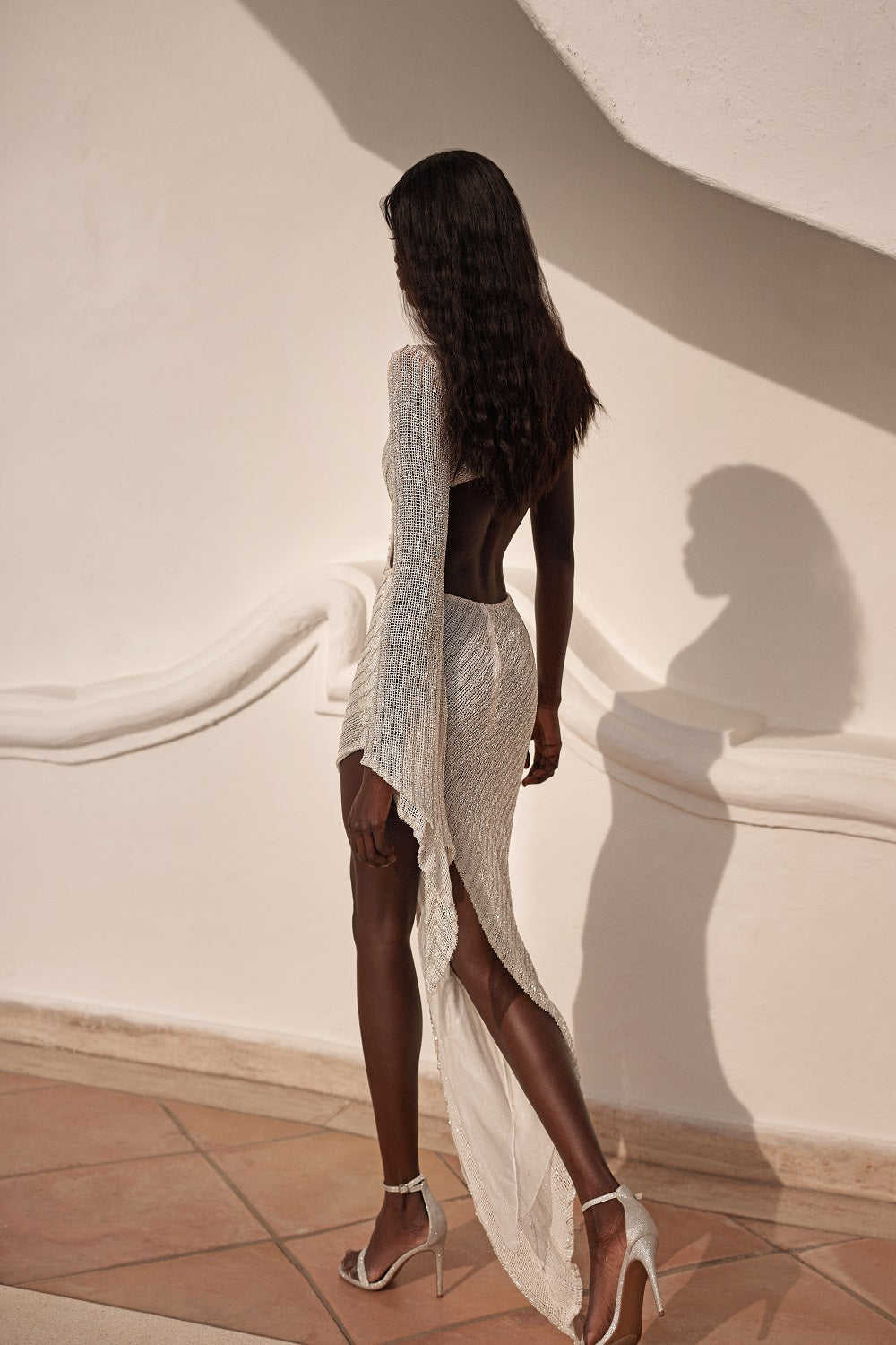 Open and round cleavage , flowing dress on the body. Bare sides, having one spilled sleeve. And varying height in the skirt... Sexy and bold