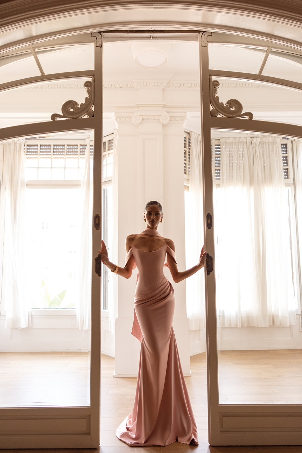 Sculpted in rose silk, this gown is the definition of quiet luxury. Featuring a structured neckline, asymmetric draping, and a romantic back sash — made to turn every entrance into a statement.