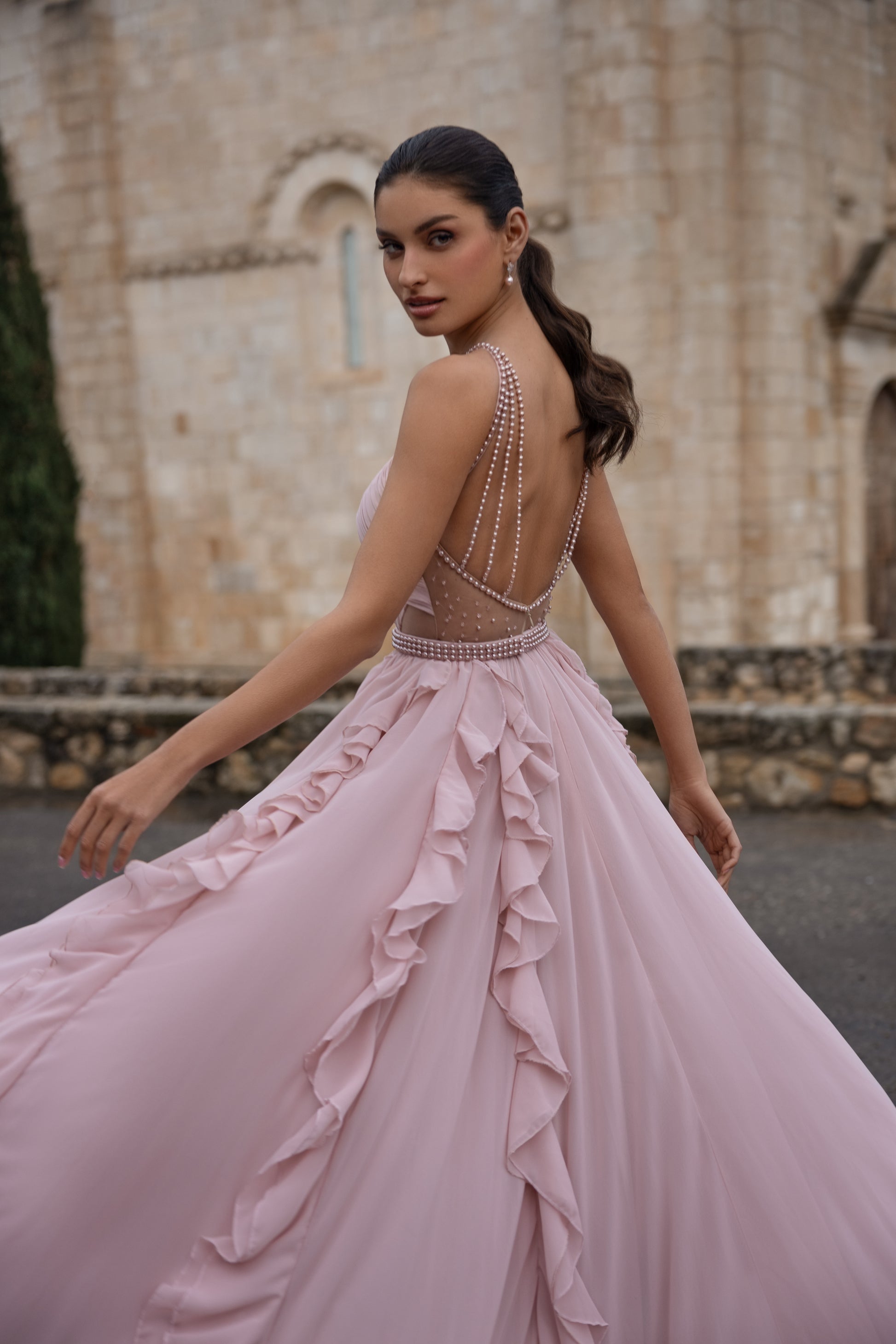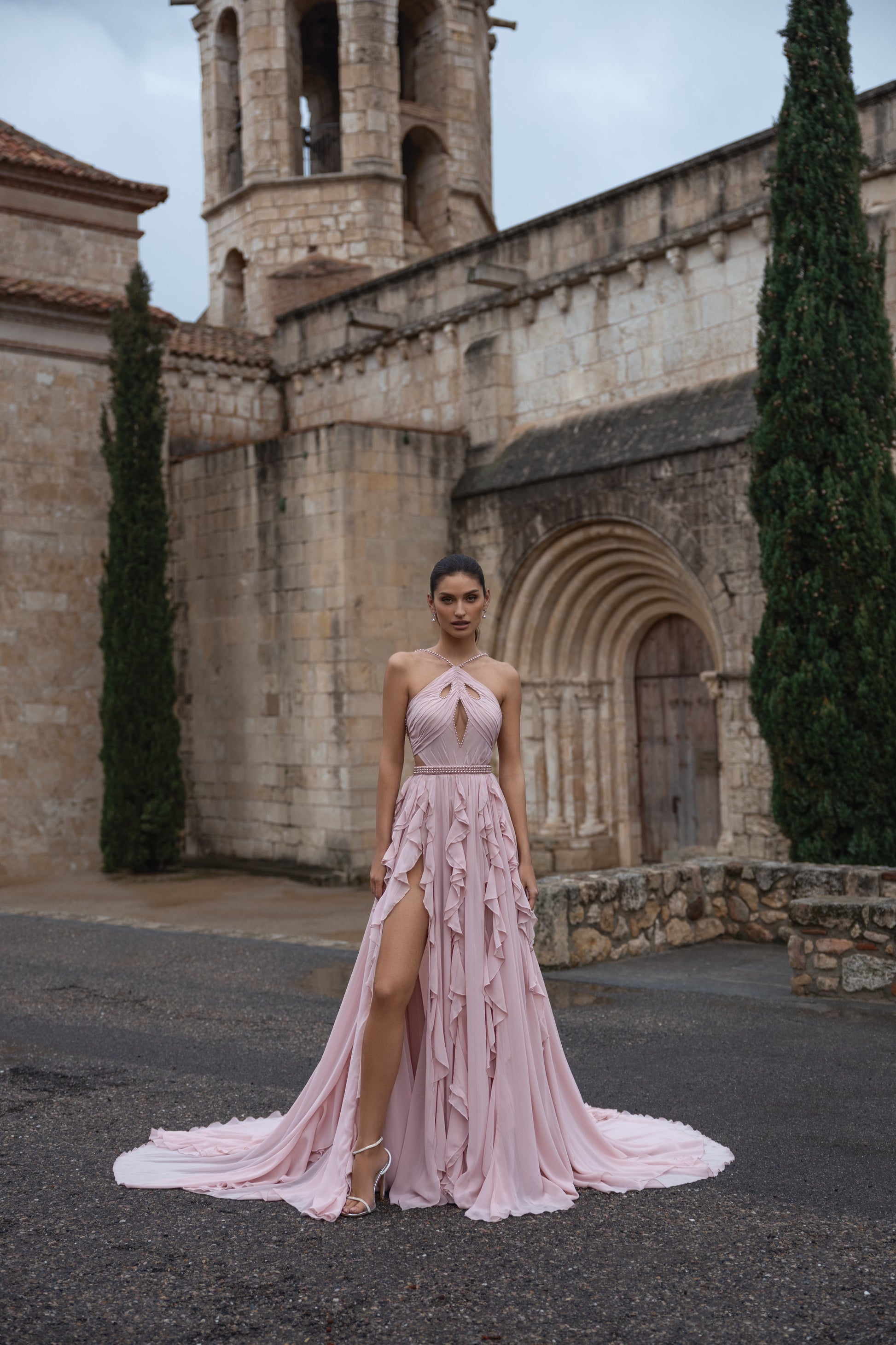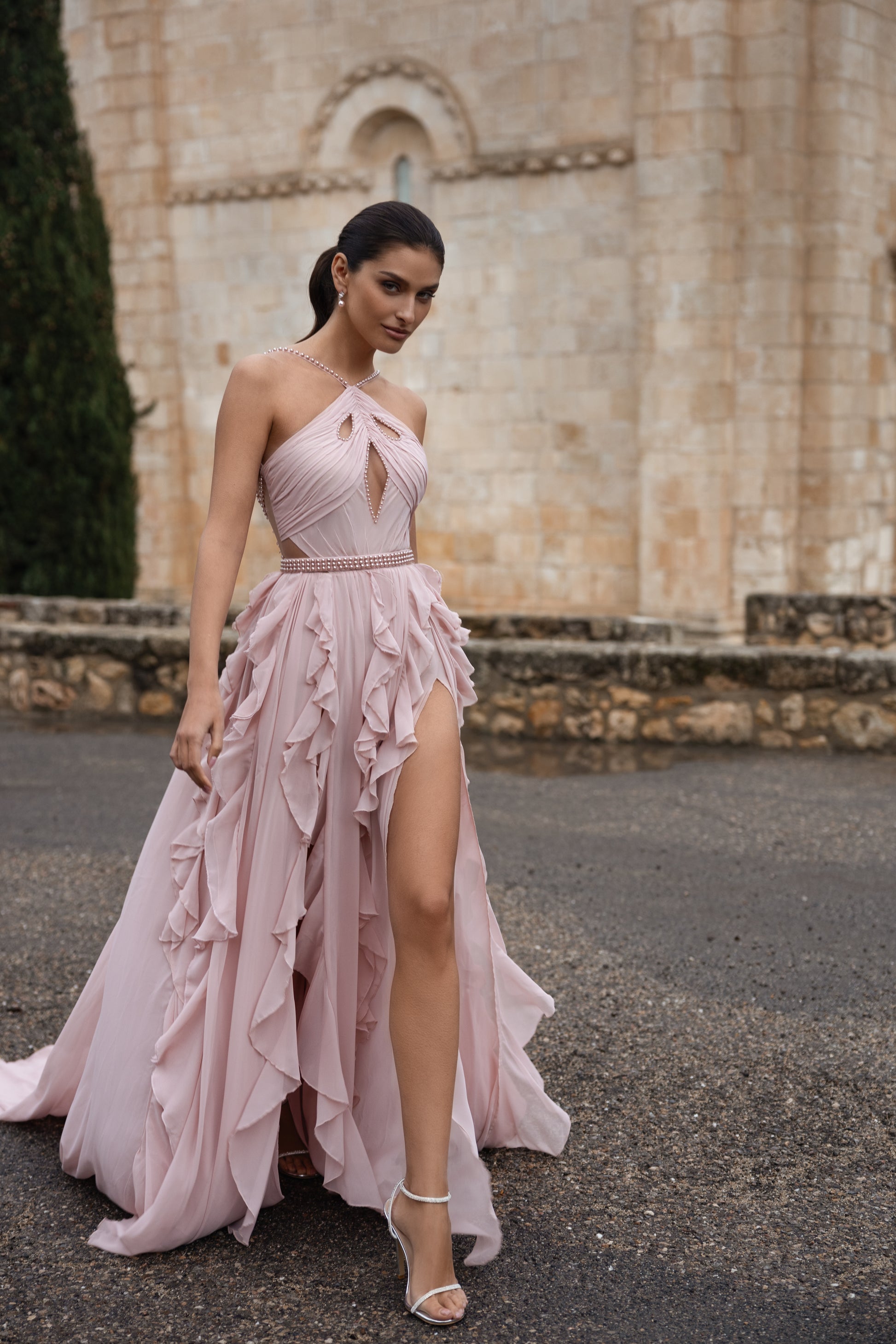 A luxurious and stunning evening dress, with a halter top and flowing chiffon and blush color embroidery