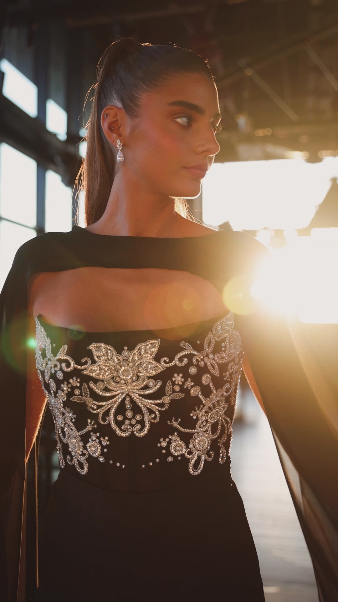 EW26-14 Style is a striking couture two-piece evening pants set designed for women who want powerful elegance with modern edge. This refined ensemble features a tailored top paired with fluid high-waist trousers, creating a confident silhouette that blends couture glamour with contemporary sophistication.