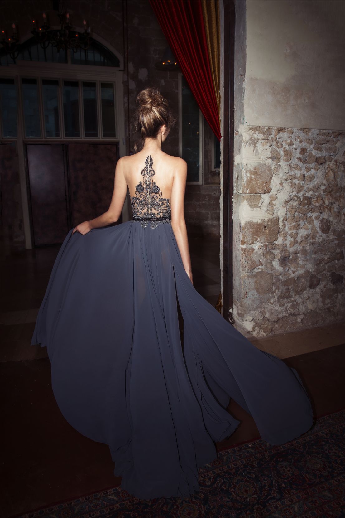 Lace top with open v shape on front and special shape on the back. Silk chiffon skirt with two high slits and lace bodysuit in grey from evening collection.