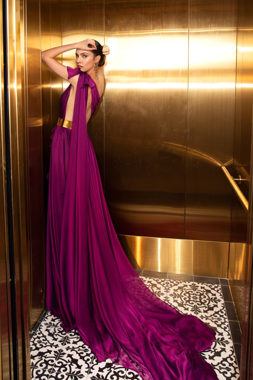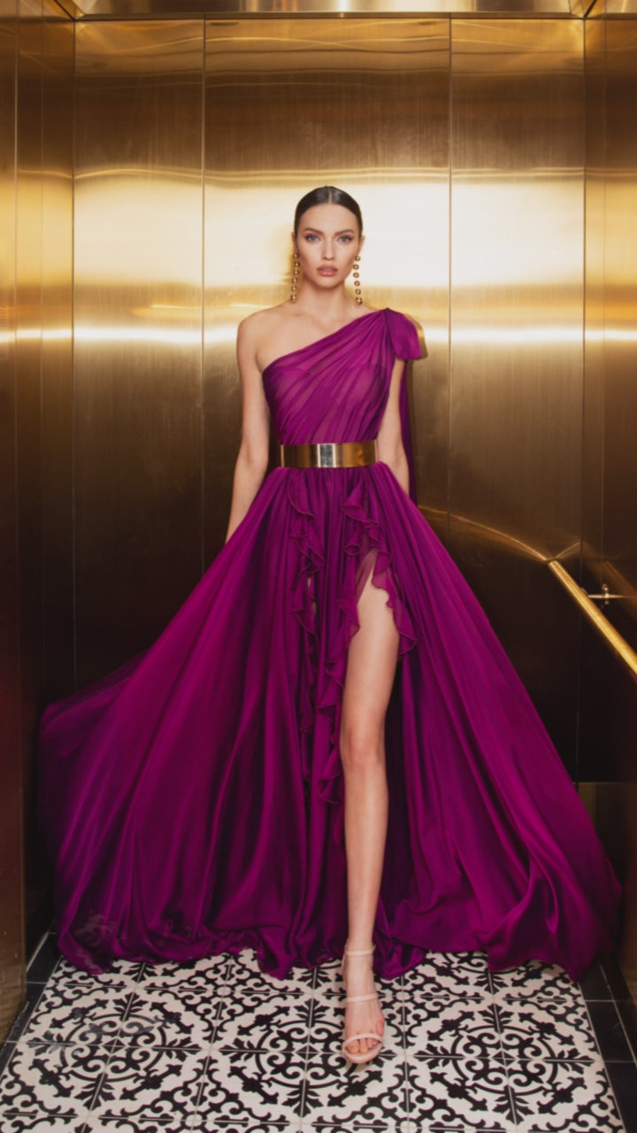Unique chiffon one shoulder dress in purple with high slit , long train and gold metal belt from evening collection.