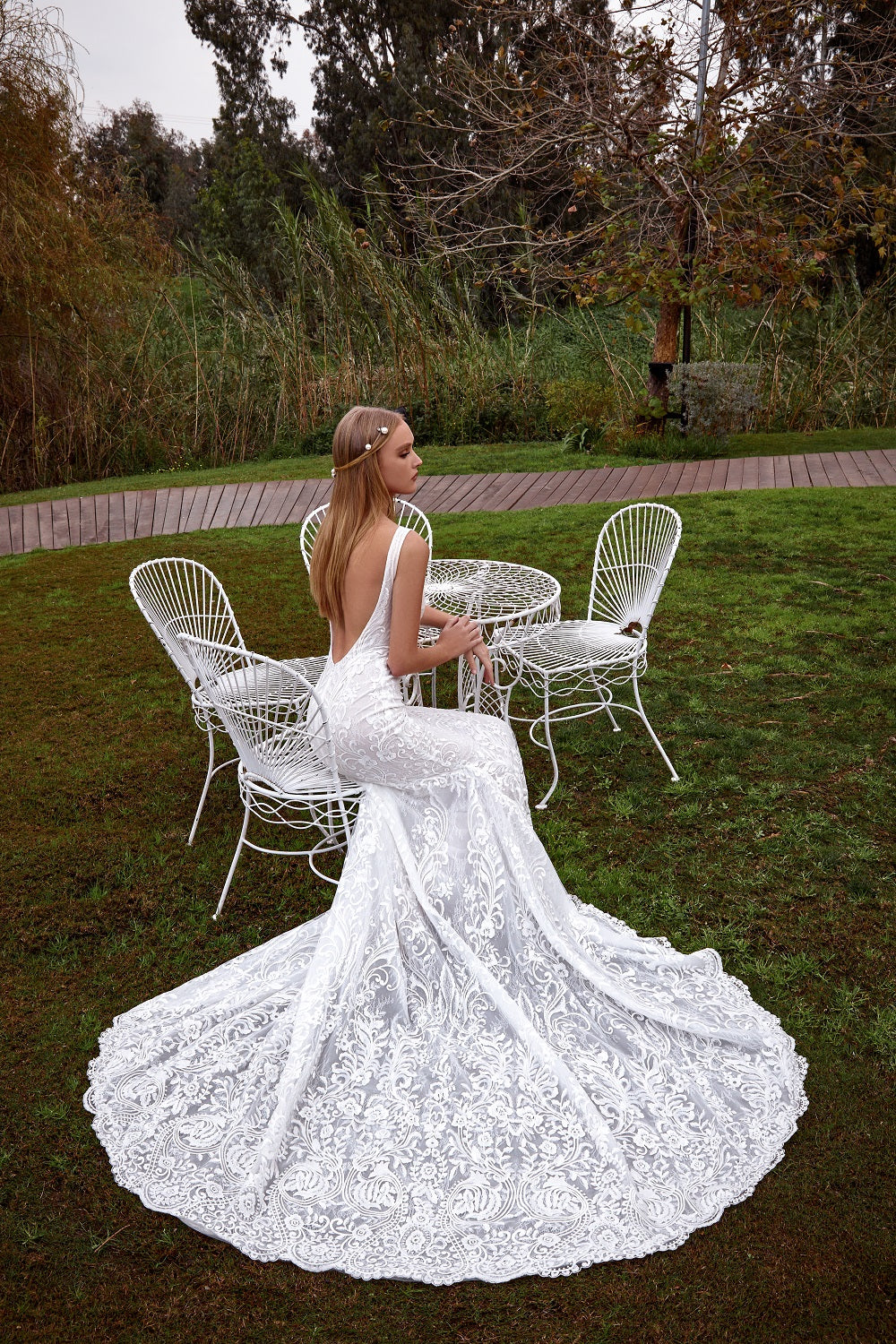 A body-contouring lace gown, with a long train and open back from mimosa line 2021.