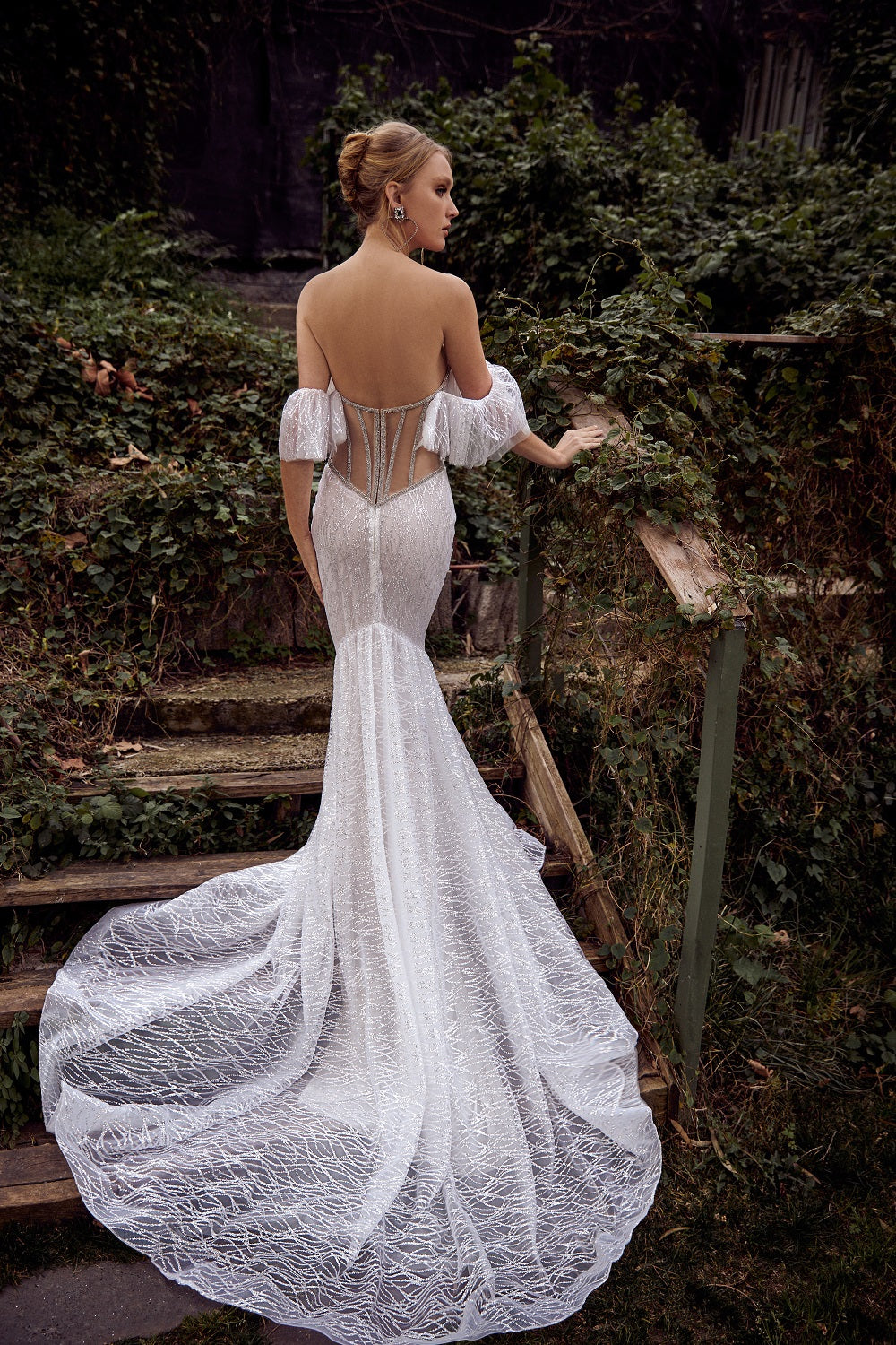 Strapless mermaid silhouette with sparkling lace and open back with delicate bow tie belt. Detachable sleeves for your favorite look.
