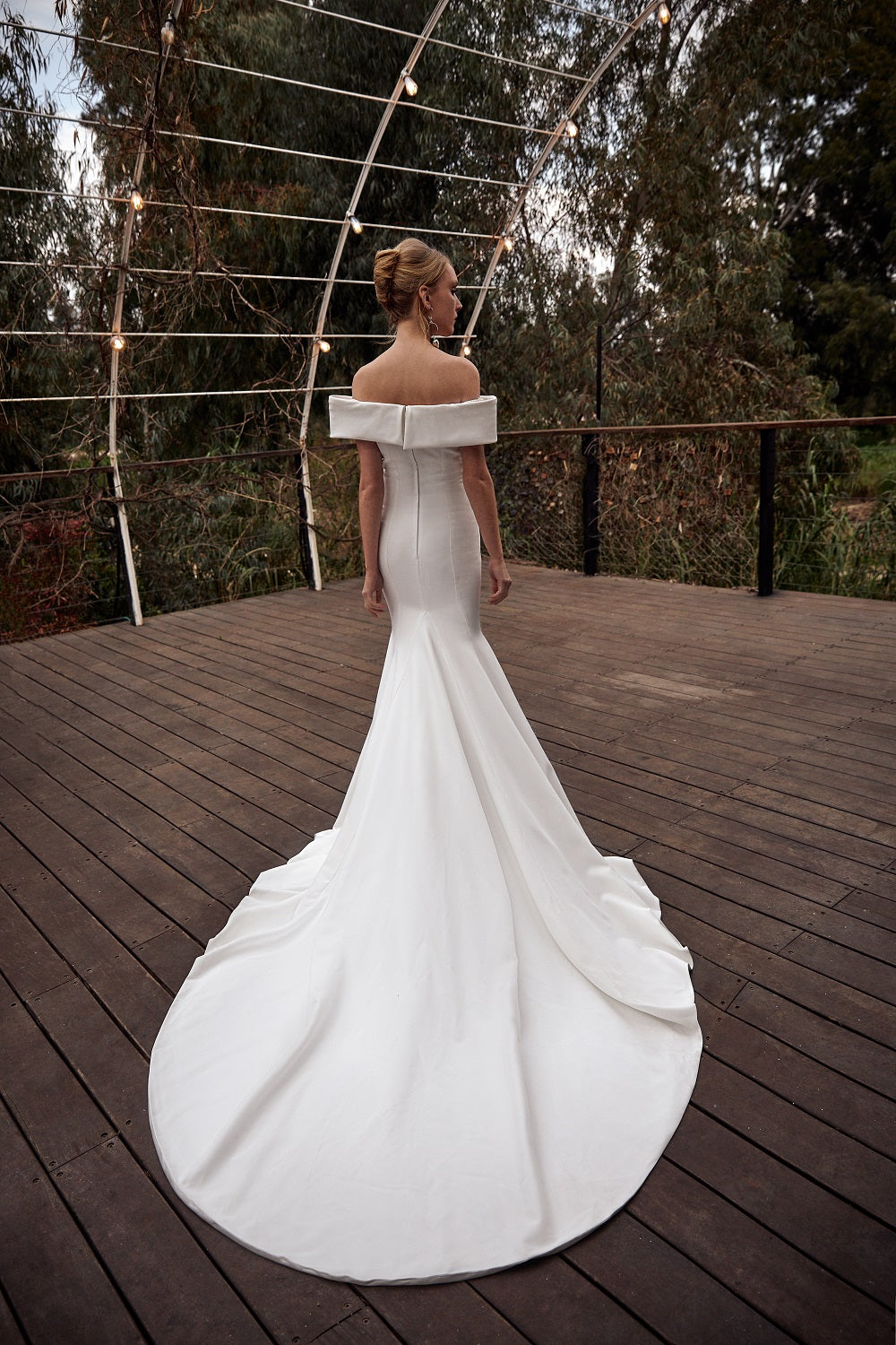 Clean and simple lines mermaid-cut crepe gown with a round long train and special off shoulders. Mimosa by Julie Vino Genesis 2021 Collection