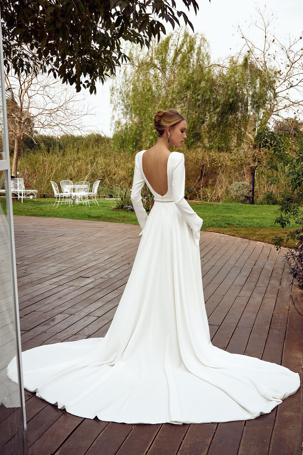 Ivory crepe dress with long sleeves with a mermaid silhouette and long train. Mimosa by Julie Vino Genesis 2021 Collection.