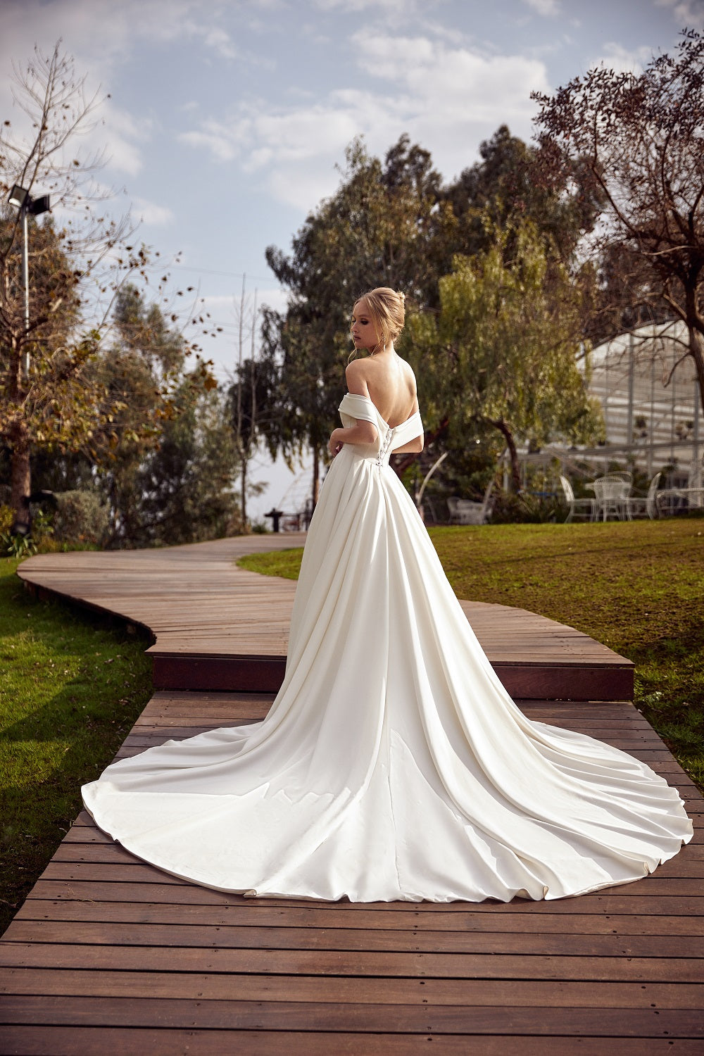 Off the shoulder corset A line dress with long train. Mimosa by Julie Vino Genesis 2021 Collection